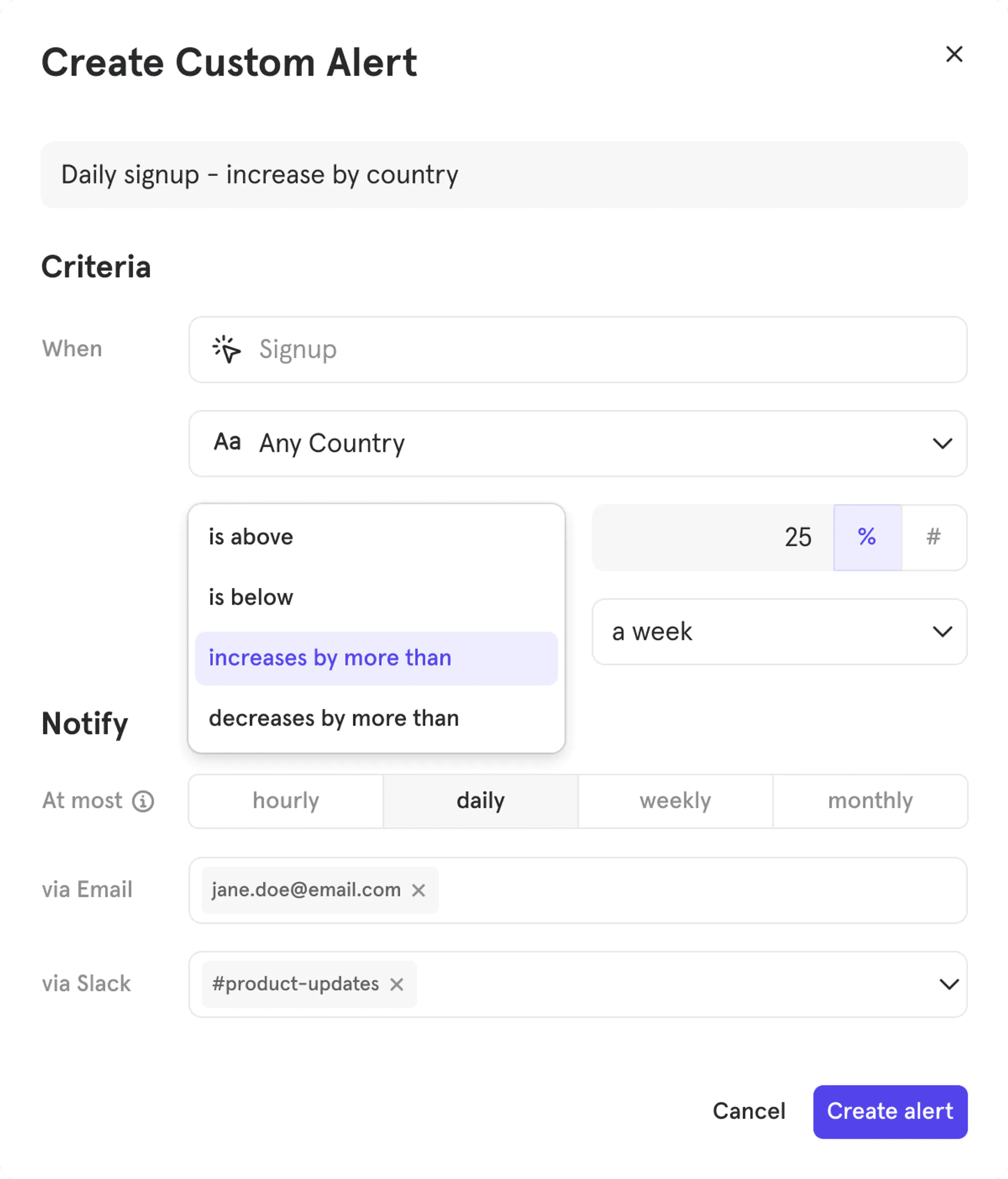 Create an alert for your Insights and Funnels reports and be notified when report conditions reach certain thresholds. Alerts are sent as an email or Slack message and can be sent to multiple users. To create an alert, follow these steps: